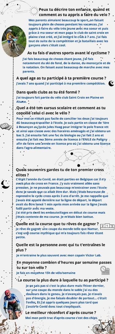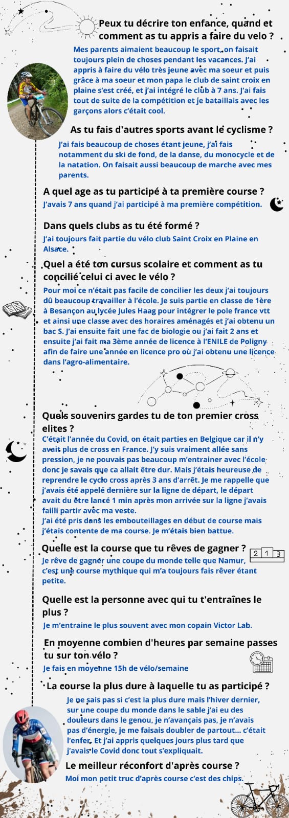 Championne de France 2023 de Cyclocross avec sa sœur sur le même podium, Elle est régulièrement dans le top 10 des coupes du monde, des championnats mondiaux et Européens dont elle a pris la médaille d'argent en U23 en 2016. Elle est dans le top 15 du classement mondial. Elle rejoindra en 2024 sur route l'UVCA Troyes Hélène Clauzel est notre nouvelle invitée de "A la rencontre de"