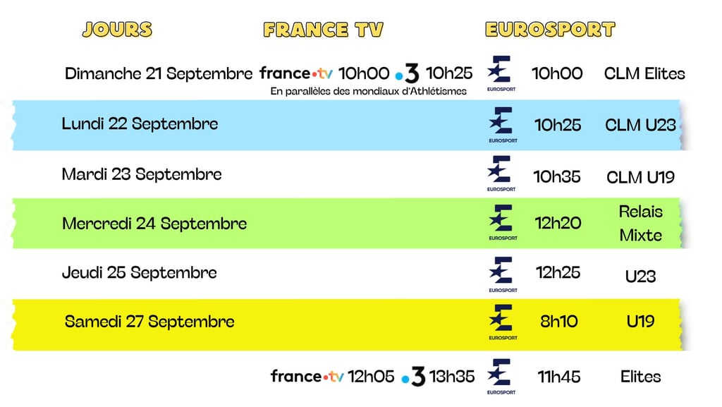 Sur les 8 jours de compétitions, 7 titres seront attribués dont :