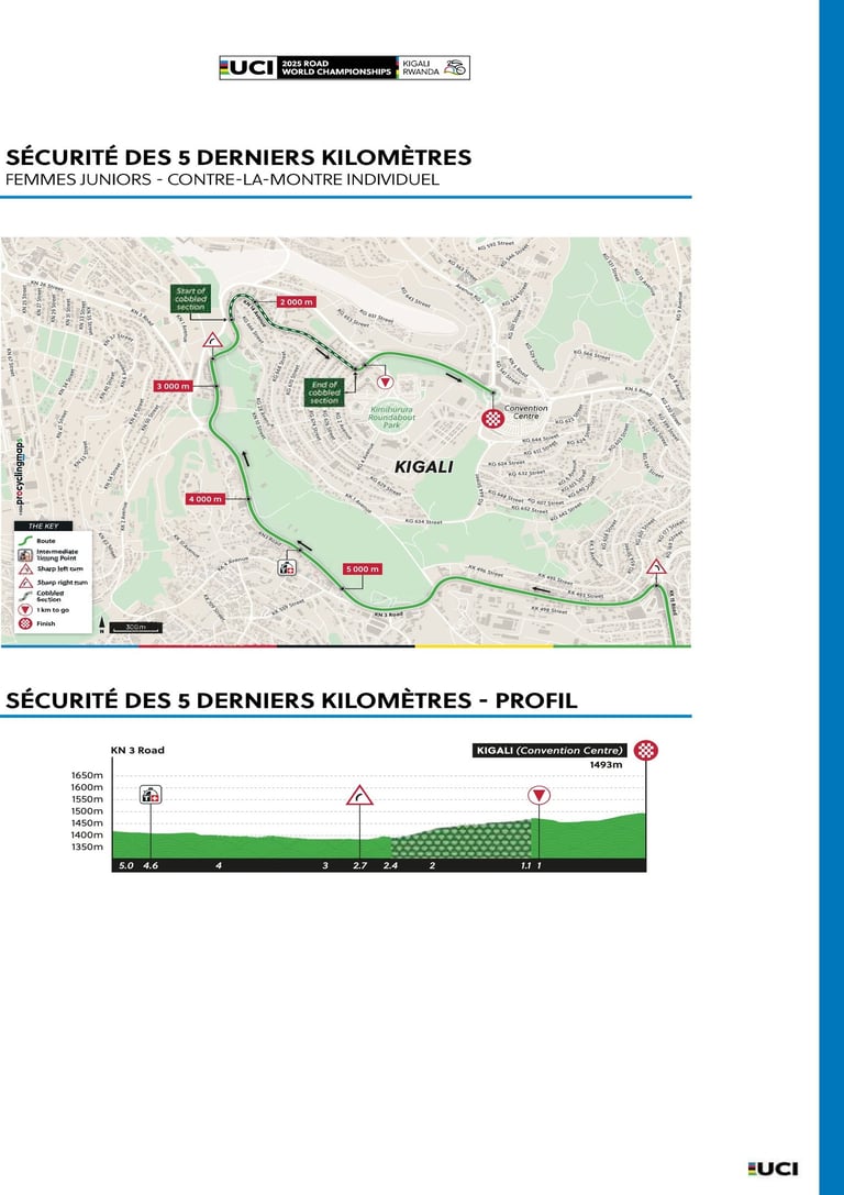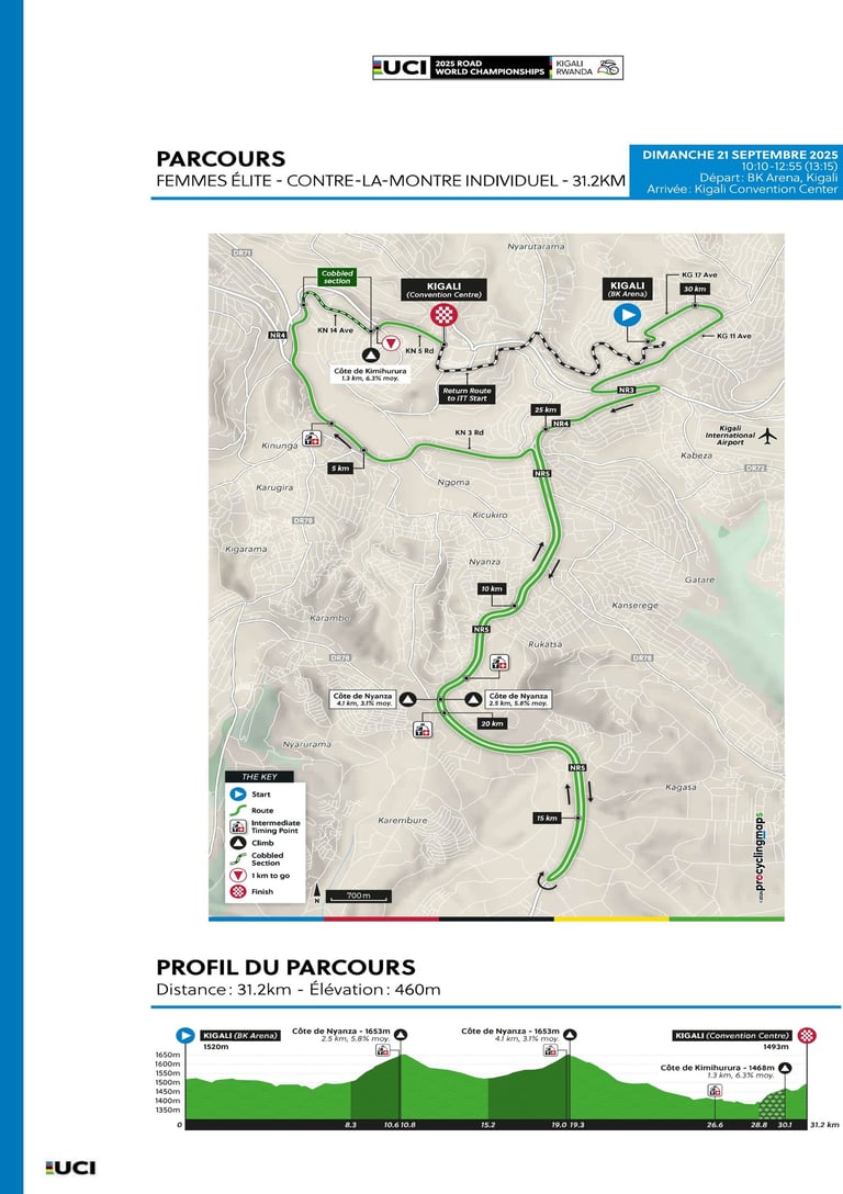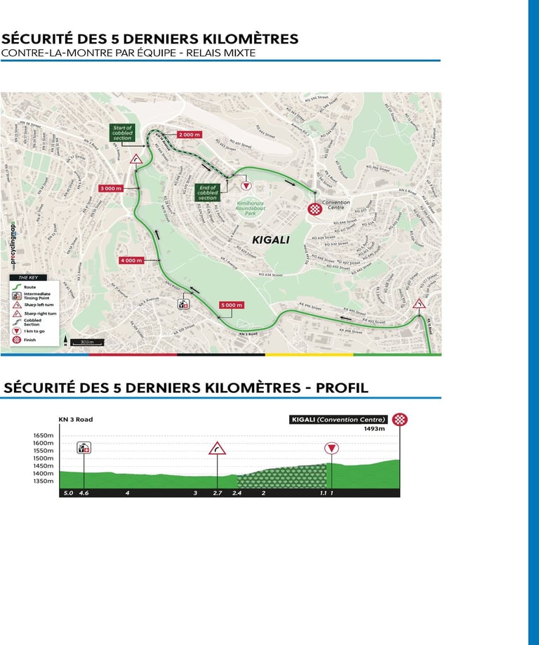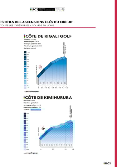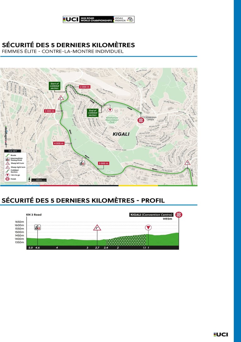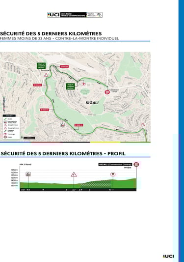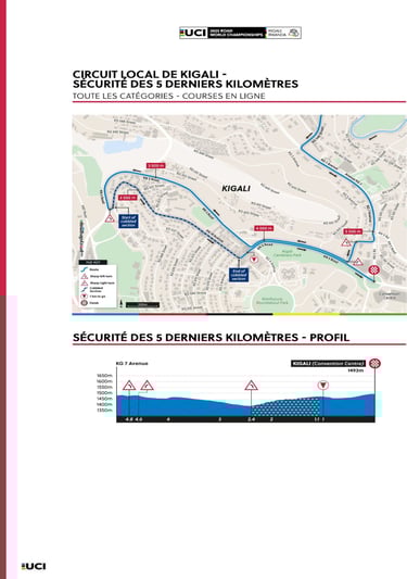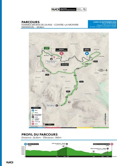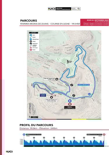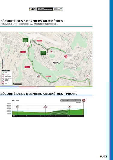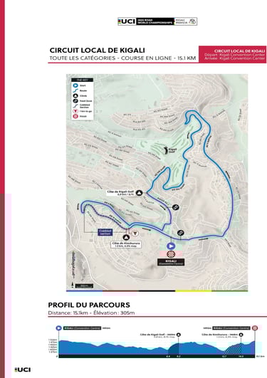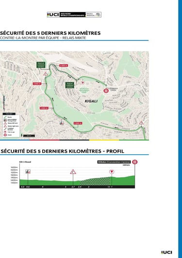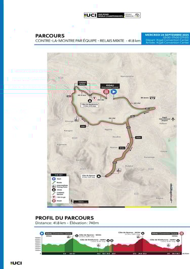 Tous les départs des Contre La Montre (Individuels et Relais Mixte) se feront à la BK Arena de Kigali, et les arrivées de toutes les courses se feront à proximité du Kigali Convention Center