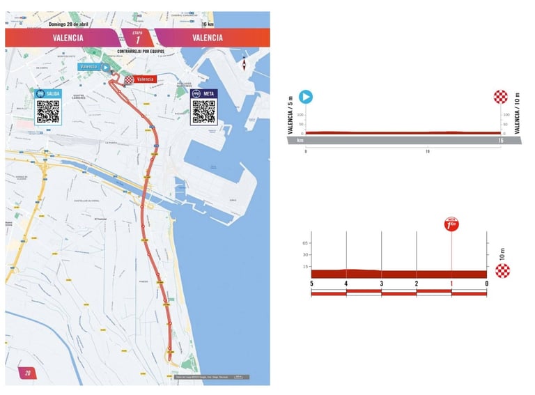 Ce contre la montre inaugural consiste en un aller-retour sur la voie rapide qui longe le bord de mer de Valence. Ce chrono favorisera les équipes ayant l’habitude d’emmener des longs bout droits tout en puissance. Sauf gros incident, il ne devrait pas y avoir d’écarts significatifs entre les favorites du classement général.