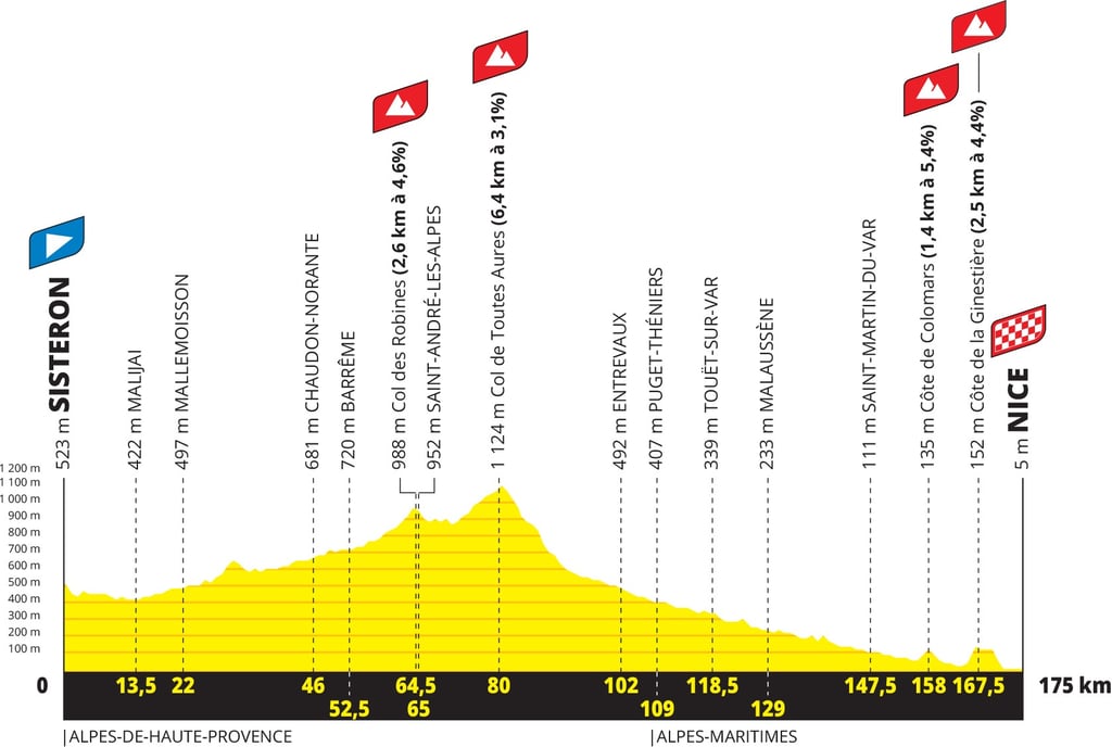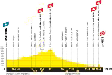 Après l’étape Reine de la veille et avant le dernier jour du Tour, c’est ce qu’on pourrait appeler l’étape des paradoxes puisque c’est l’étape la plus longue mais c’est aussi celle qui a le moins de dénivelé. Après le départ de Sisteron, les coureures encore en course grimperont jusqu’au col de Toutes Aures, point culminant de cette étape puis descendront dans la vallée en suivant le Var.