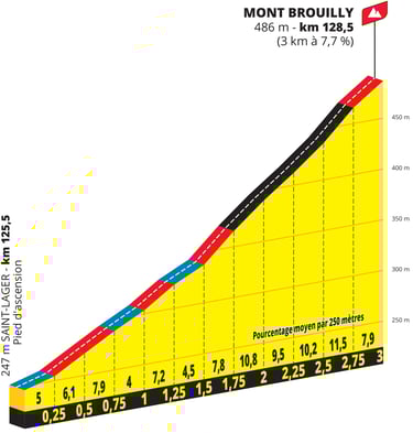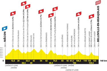 Pas moins de 8 classements des grimpeuses sont au programme dont le 1er situé après 12,5 Km de course et le dernier le mont Brouilly (3 km à 7,7 %) situé à 12 Km de l’arrivée. Une étape pour puncheuses baroudeuse et ayant des talents de descendeuses sera attendue à l‘arrivée.