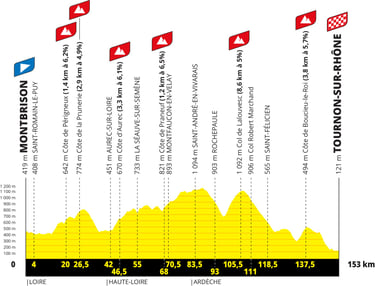 De la Loire à l’Ardèche, ce sont les monts du Forez et du Pilat que les coureures auront à escalader sur une étape casse patte qui n’offrira que de rares moments de plat aux coureures. La dernière difficulté située à 16 km de l’arrivée pourrait être un tremplin pour les coureures voulant faire un rapproché au classement général.