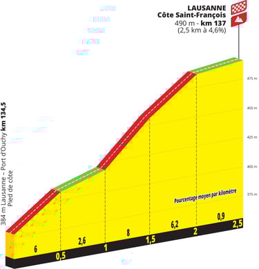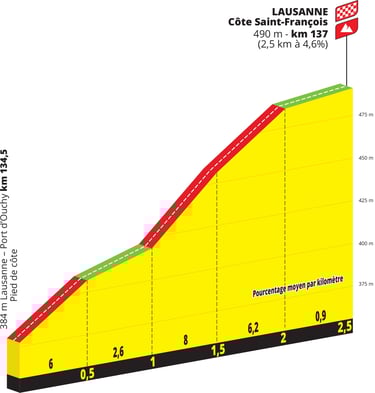 La première étape sera une belle entrée en matiére pour les puncheuses avec un parcours vallonné et surtout une arrivée pour les sprinteuses/puncheuses avec en guise de montée finale la Côte Saint-François (2,5 km à 4,6%).