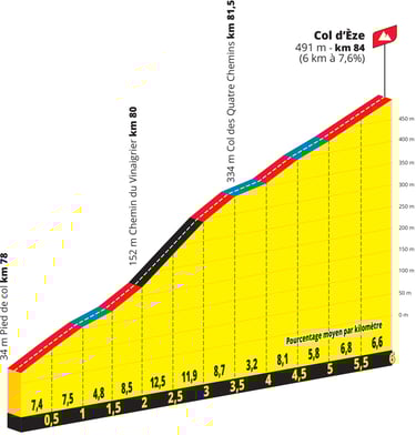 Quoi de mieux qu’une étape courte et explosive pour finir cette 5ème édition du Tour de France Femmes avec Zwift. 4 tours de circuits autour de Nice avec 4 ascensions du col d’Eze (7,7 km à 5,9%) dont la dernière par son versant le plus dur, le chemin du vinaigrier avec ses passages à 18%.