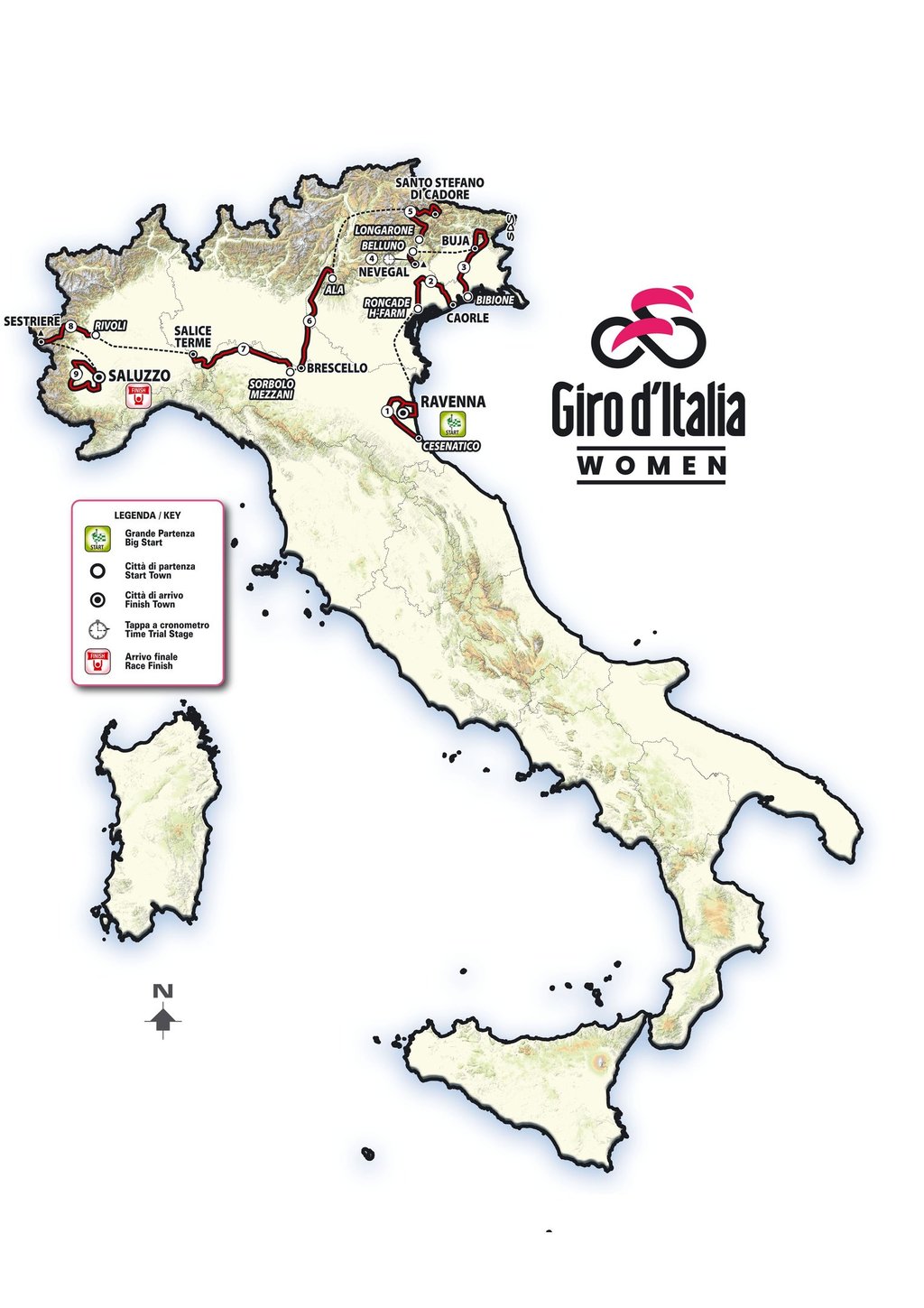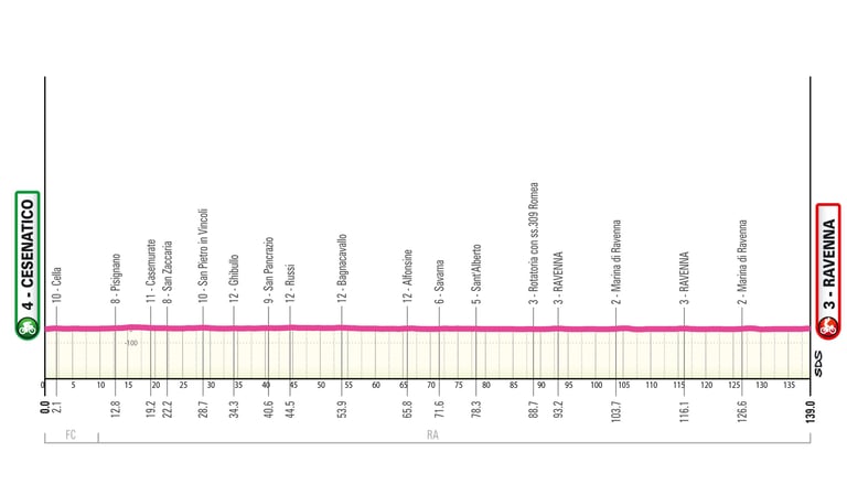 Après un départ en bord de mer à Cesenatico, ville natale de la championne d’Italie 2013 Dalia Muccioli et également connue pour avoir vu grandir Marco Pantani, le peloton s’enfoncera dans les terres pour revenir vers Ravenna où 2 tours de circuits de 23 km clôtureront la 1ére étape de ce Giro complétement plate où une sprinteuse revêtira sans aucun doute le 1er maillot rose.