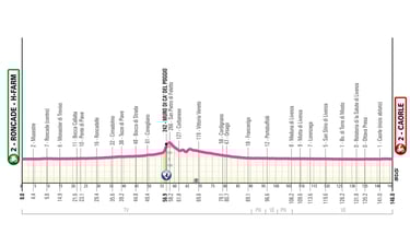 C’est l’étape la plus longue du Giro Women avec ses 165 Km.Un première partie d’étape plate emmènera, peu après la mi-course, les athlètes qui grimperont jusqu’aux 2 difficultés du jours concentrées sur 15 Km avant une longue descente vers l’arrivée.Une étape pour baroudeuses.