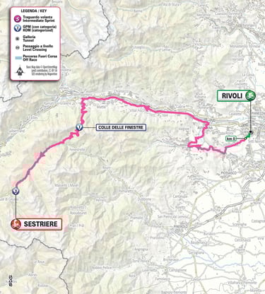 Une étape qui promet d’être épique et qui ancrera la course dans l’Histoire du cyclisme féminin avec au programme 2 ascensions mythiques. Tout d’abord, les coureures devront franchir le Colle delle Finestre avec ses 18 kms moitié asphaltés et moitié en graviers. Ce col sera la Cima Alfonsina Strada du haut de ses 2178 m d’altitude. Après la descente, un autre lieu mythique, l’ascension finale vers Sestrières 15 Km d’ascension pour une arrivée à plus de 2000m