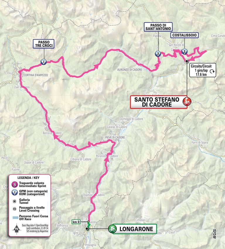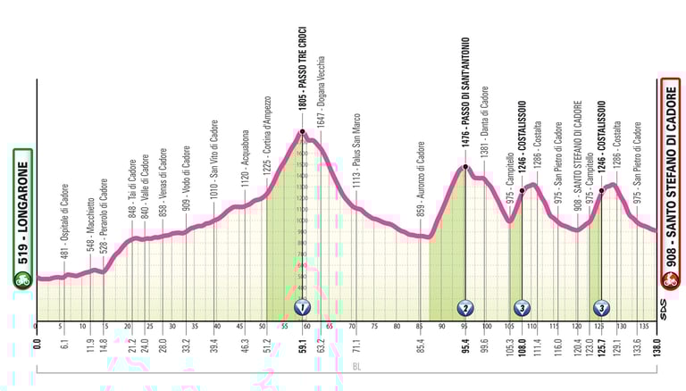Après le chrono, les coureures se frottent aux Dolomites avec cette 1ére étape de haute montagne.3 sommets, dont le Passo Tre Croci (1805m), à gravir avant de passer une première fois sur la ligne d’arrivée, les coureures auront à franchir une 2ème fois le Costalissoio dont le sommet est situé à 9 km de l’arrivée.